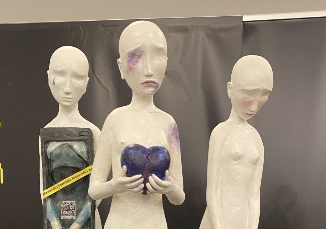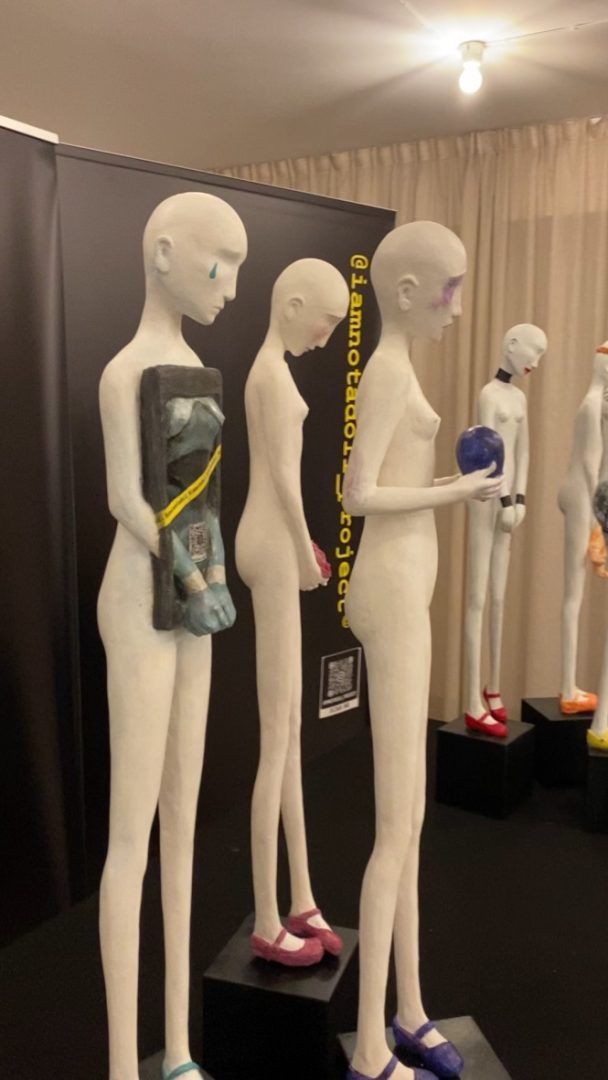 Ms. Paraskeva launched the I am Not a Doll Project (@Iamnotadoll_project) on February 6th, 2021, World Zero Tolerance Day for Female Genital Mutilation (FGM). It took Ioanna two years to create the six doll-like sculptures. Each figure wears uniquely colored shoes and represents one of six major issues women still face: sexual harassment and rape (yellow), domestic violence (blue), forced and early marriage (orange), female genital mutilation (pink), trafficking (red), and cyber abuse (green).
