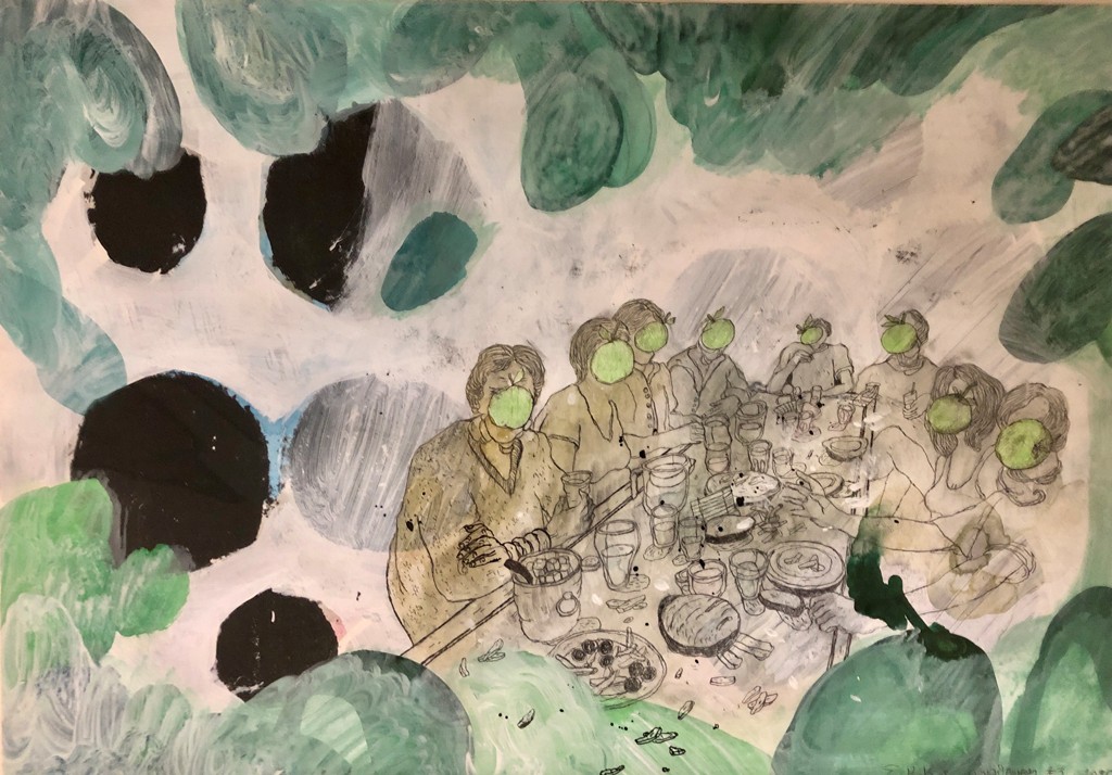 - Stefanos Rokos, Gathering#3, 2020, Mixed media on paper, 40×55 cm