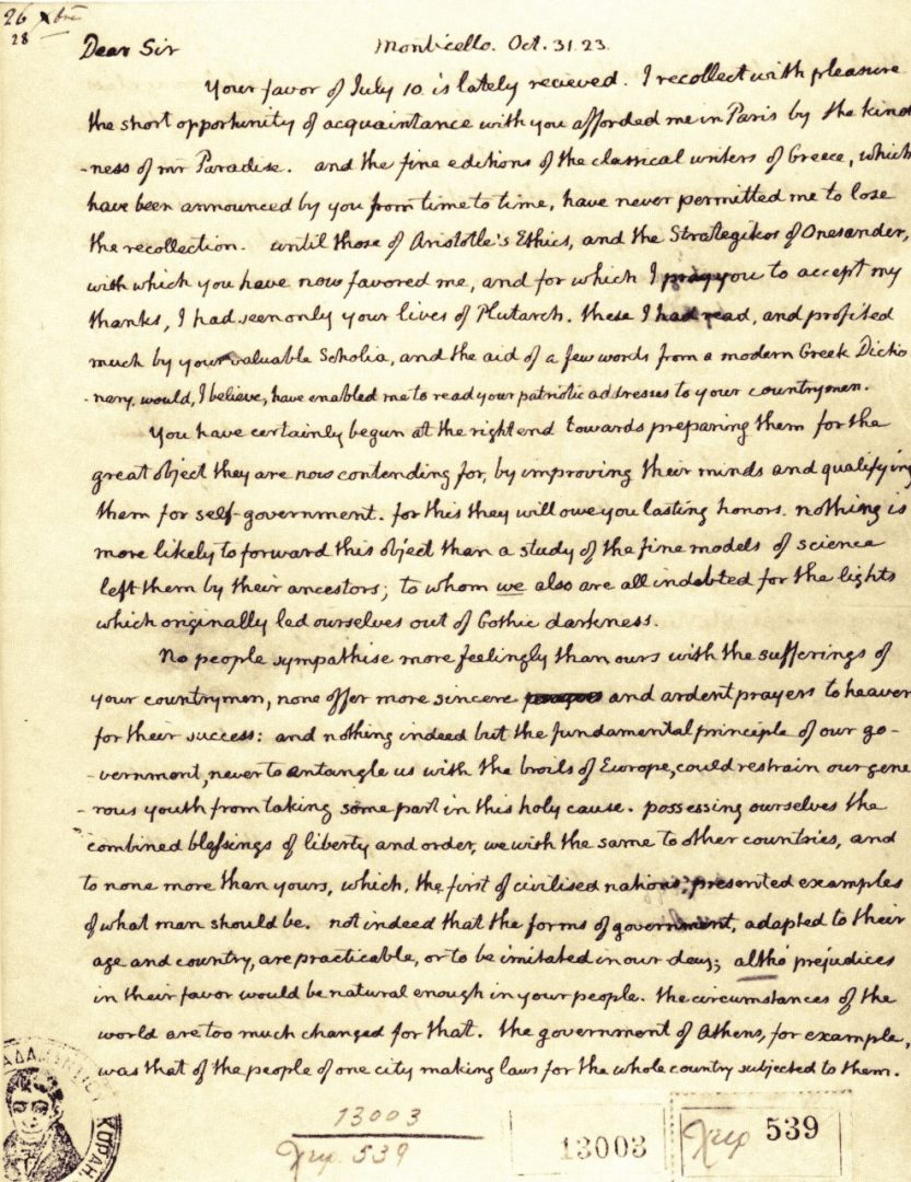 - Letter from Thomas Jefferson to Adamantios Korais, October