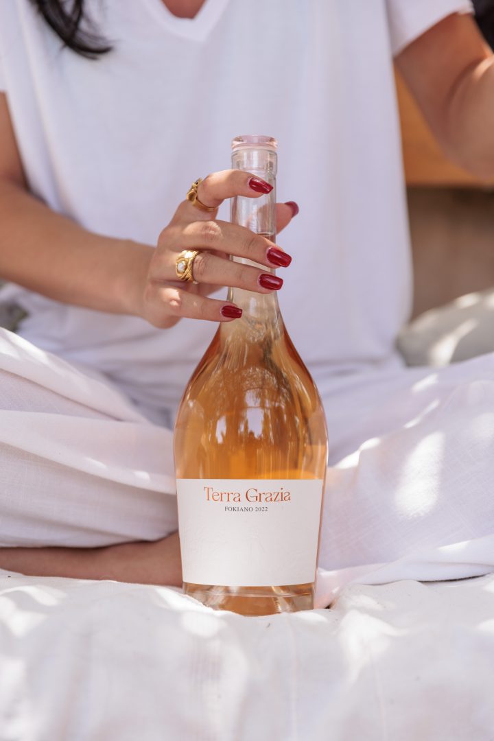 Our rosé Terra Grazia Fokiano. This is a gastronomic rosé for aging from the Cycladic variety Fokiano, with a rich aromatic character, full body, and long aftertaste.
