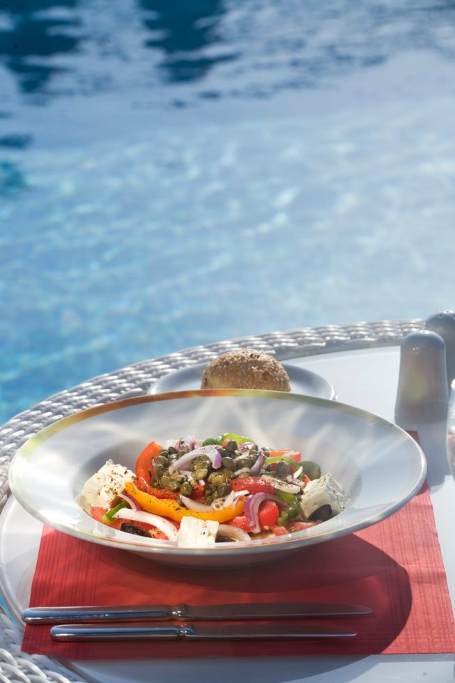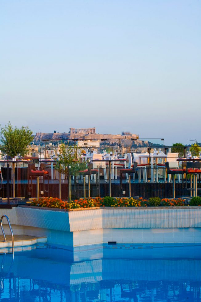 - An outdoor rooftop pool provides a place to swim during the summer months while looking out on Athens