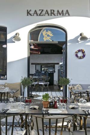 - Kazarma, Manto’s home in Mykonos now houses a restaurant by the same name. Cine Manto to the right is a beloved open-air cinema