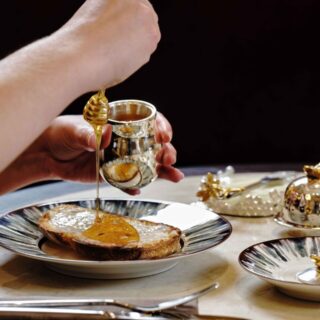 The menu curated by Asterios Koustoudis and Nikos Livadias leans into Greek ingredients, clean flavours, and a zero-waste philosophy. One dish, “Bread, Butter & Honey,” a Madeleine de Proust for most Athenians – a nostalgic throwback to childhood mornings that marries honey from the hotel’s own hives in Kerkini, butter from small producers in Deskati, and freshly baked sourdough from the King George’s bakery. Simple. Honest.