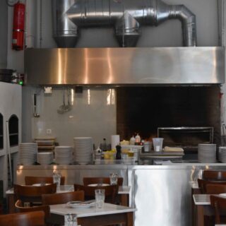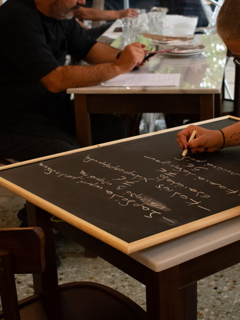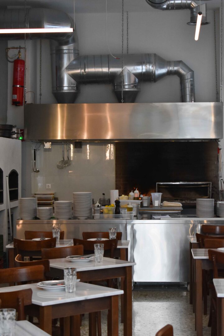 Open for just over a month on its own namesake square in Pangrati, Plyta feels like someone grafted a neighbourhood kafeneio onto a gleaming industrial kitchen and then piped in the smoke from a proper grillhouse. You don’t come to Plyta to gawp at the decor. You come to eat. Which is, refreshingly, the point. Mosaic floors. Marble-topped tables. Wooden chairs. Grey walls. An open kitchen framed in metal, breathing gently over the flames. It’s minimalist, cool-toned, and uninterested in theatrics.