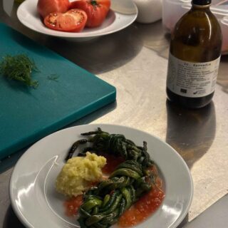 We ordered the tomato salad, drizzled with olive oil and oregano, a delicious leek and potato stew, a graviera pie – a textbook example of how Greek tavern classics can be restored to glory, an unapologetically garlicky skordalia, a fluffy, and surprisingly bold omelette with green chillis, glazed, woodfired carrots and raw prawns from Koilada. We ended with Pediaditakis’s buttery galaktoboureko.