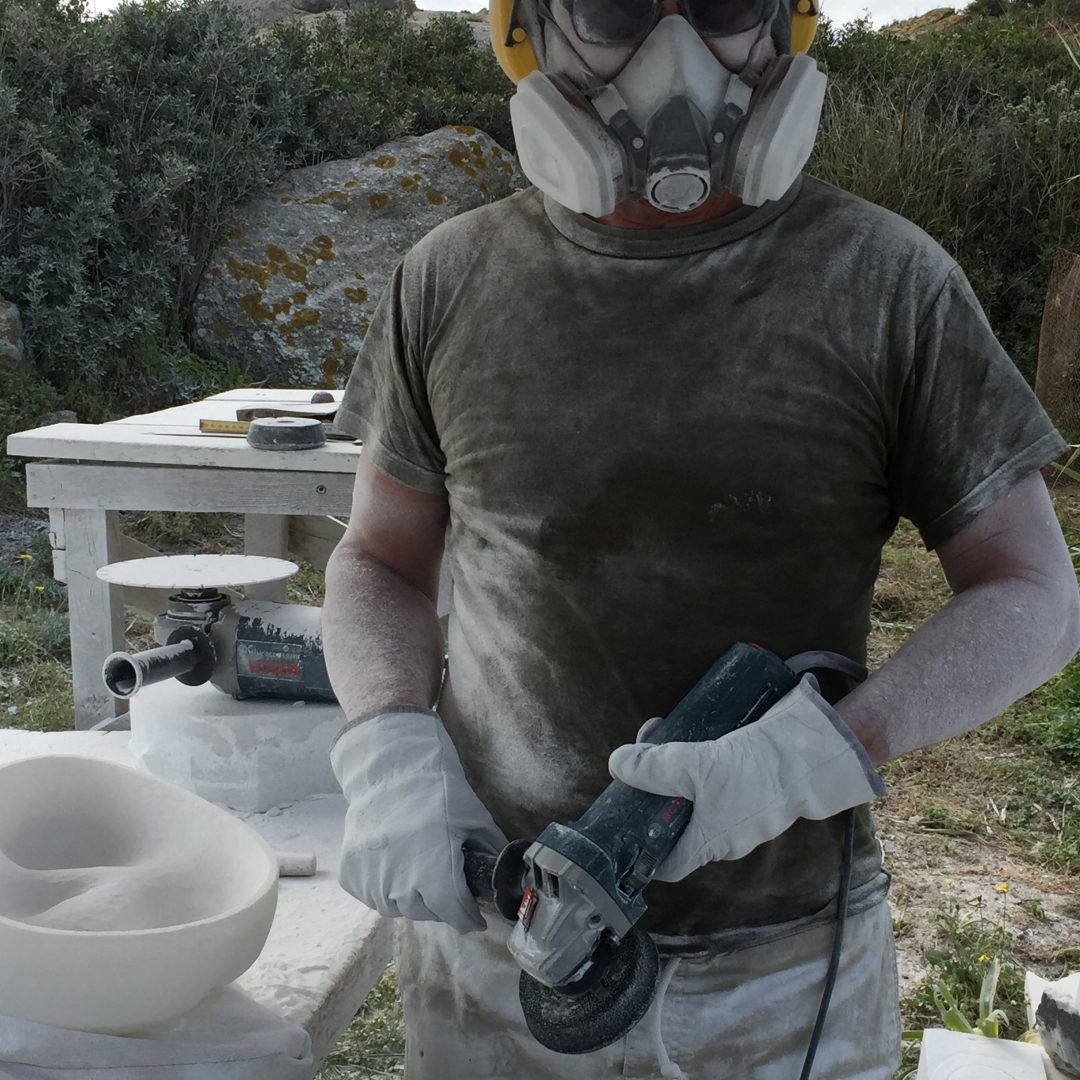 The Naxian marble that drew Tom von Kaenel to move to Naxos five years ago, was used for the roof tiles of the Acropolis in Athens and for the statues that line the sanctuaries of the Greeks in antiquity. The coarse crystalline structure of this marble allows the light to shine through, lending it an airy, almost ethereal quality. At his studio on Naxos, he chisels vessels, objects and sculptures influenced by the simple lines of early Cycladic craftsmanship, the whimsies of baroque and the functional aesthetic of 20th-century ceramics, reinterpreted or reassembled to lend each of his creations their individuality and powerful character.