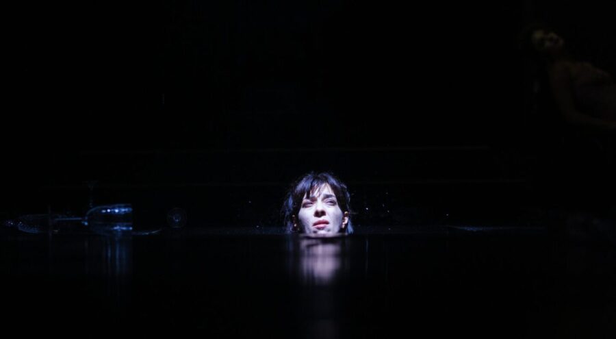 Tarlow sets the play in the aftermath of a cabaret party with Electra standing out from the rest of the characters by spending a large amount of time in a pit beneath the stage floor, whose two sliding doors leave a hole open through which her head is visible. From this underground prison-like space she mourns and laments while droplets of water often fall directly on her face yet nowhere else onstage. The raindrops seem to magnify her tears, making her continual weeping more pronounced. Electra’s physical entrapment reflects her emotional confinement and makes all the more evident her inability to move on. As Tarlow himself noted in a Q&A after the play, the staging is intended to recall Samuel Beckett’s Happy Days, in which Winnie is embedded up to her waist in a mound of earth, immobilized, yet still able to speak, her voice being the main instrument of her resistance. Like Winnie, Sophocles’ Electra is a figure confined and trapped; her voice, however, cannot be silenced and her constant laments remind everyone of the injustice incurred.